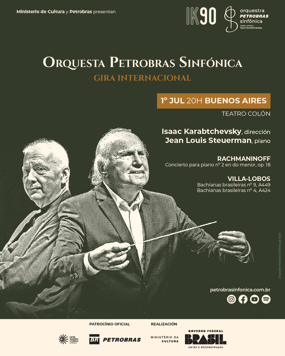 La Orquesta Petrobras Sinfónica se presentará en el Teatro Colón en su primera gira internacional. Bajo la batuta de su director titular y artístico, Isaac Karabtchevsky, la Orquesta interpretará obras de Heitor Villa-Lobos y Sergei Rachmaninoff, así como solos del pianista Jean Louis Steuerman. La presentación tendrá el siguiente programa:
