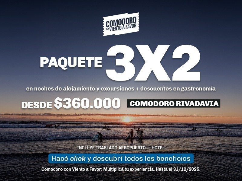 Comodoro Rivadavia expone “Con Viento a Favor”, una campaña de beneficios vigente hasta el 31 de diciembre y contempla promociones exclusivas como 3×2 en noches de hotel y excursiones, descuentos en gastronomía y comercios adheridos, así como paquetes turísticos desde $360 mil que incluyen alojamiento y excursiones.