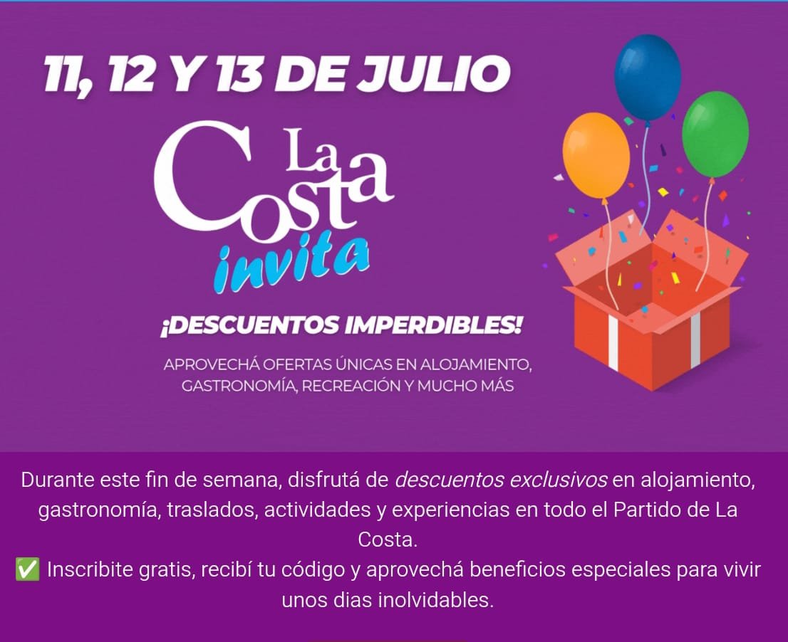 La Costa Invita es un programa de beneficios turísticos que conecta a visitantes con prestadores locales que ofrecen descuentos y promociones en alojamiento, gastronomía, excursiones, actividades, productos regionales y más, al que pueden acceder los visitantes al Partido de La Costa, de manera gratuita.