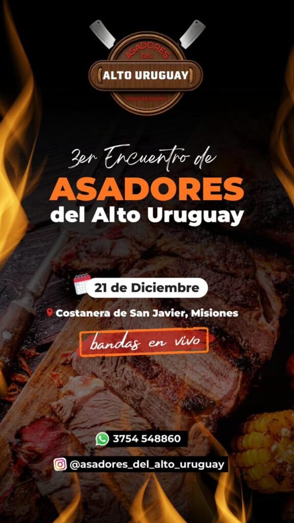 Este domingo, la Costanera de San Javier (sector Piedra Grande) será el escenario del 3er Encuentro de Asadores del Alto Uruguay. El evento, que abrirá sus puertas al público de 08:00 a 20:00 hs, promete una jornada cargada de folklore, chamamé y los mejores sabores de la región.