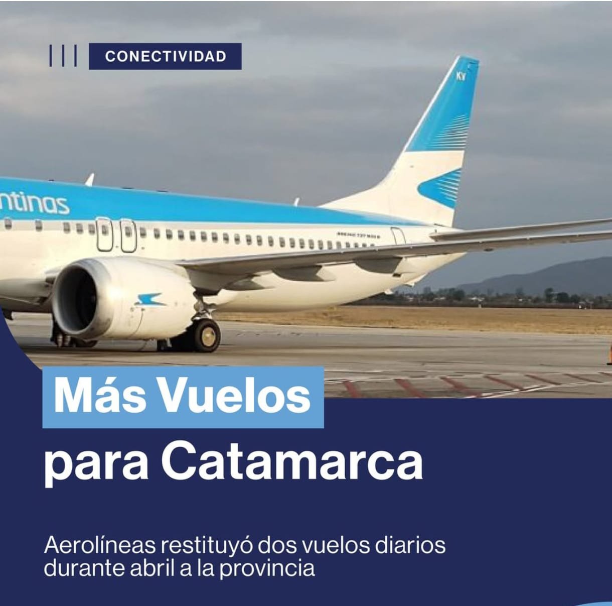 Aerolíneas Argentinas notificó este viernes que restituyó la frecuencia de dos vuelos diarios -un total de 13 vuelos semanales- para el mes de abril a la provincia de Catamarca, atendiendo a la demanda realizada en insistentes gestiones por el Gobierno provincial.