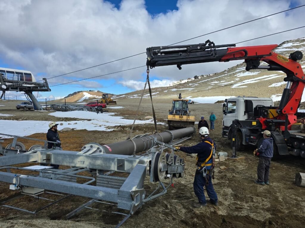 Para su ejecución se trasladó una grúa especialmente a Esquel. Esta intervención, a cargo de un equipo técnico especializado en trabajos en altura, forma parte de las labores que habitualmente no son visibles para el público, pero que resultan esenciales para garantizar el correcto y seguro funcionamiento de los medios de elevación.
