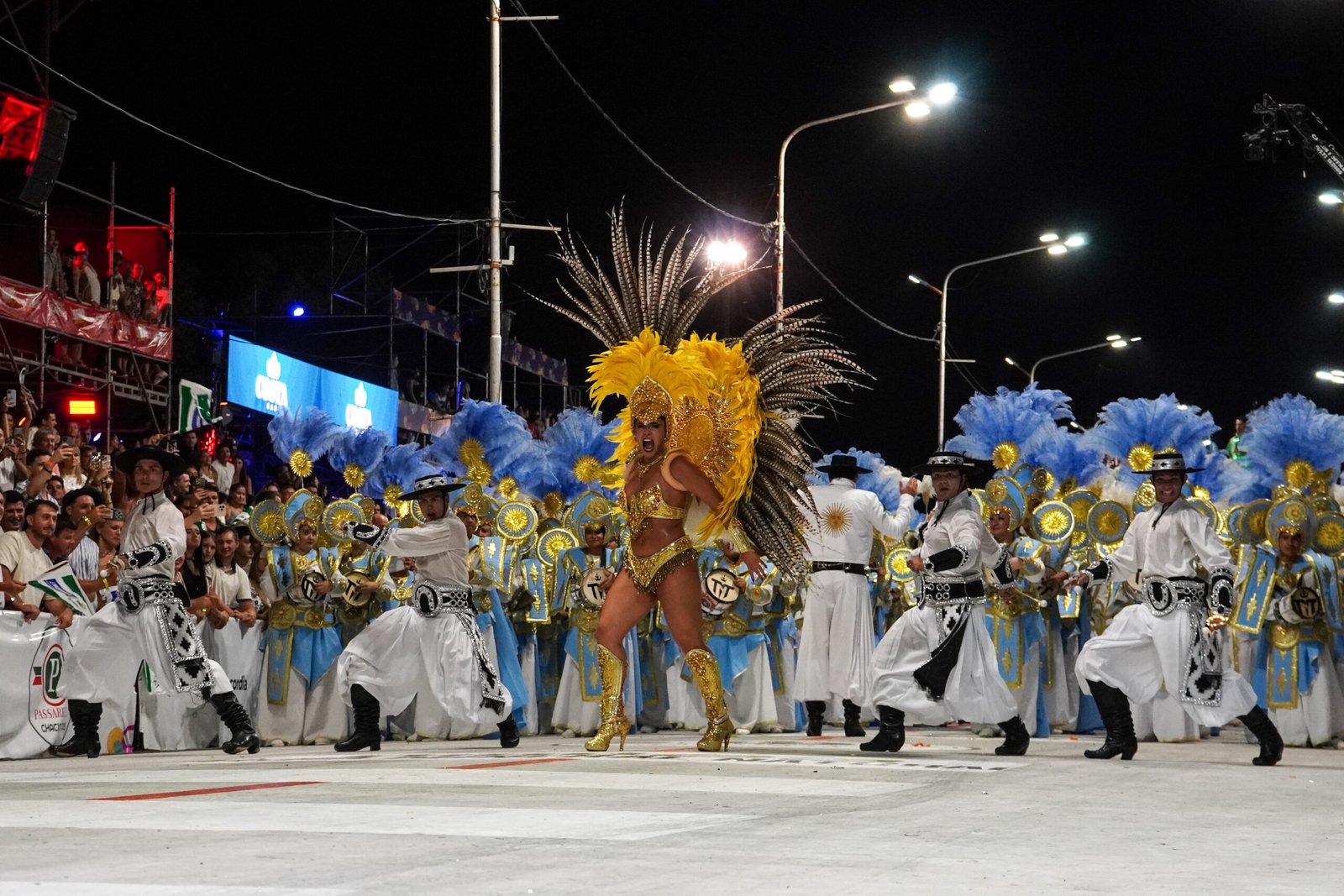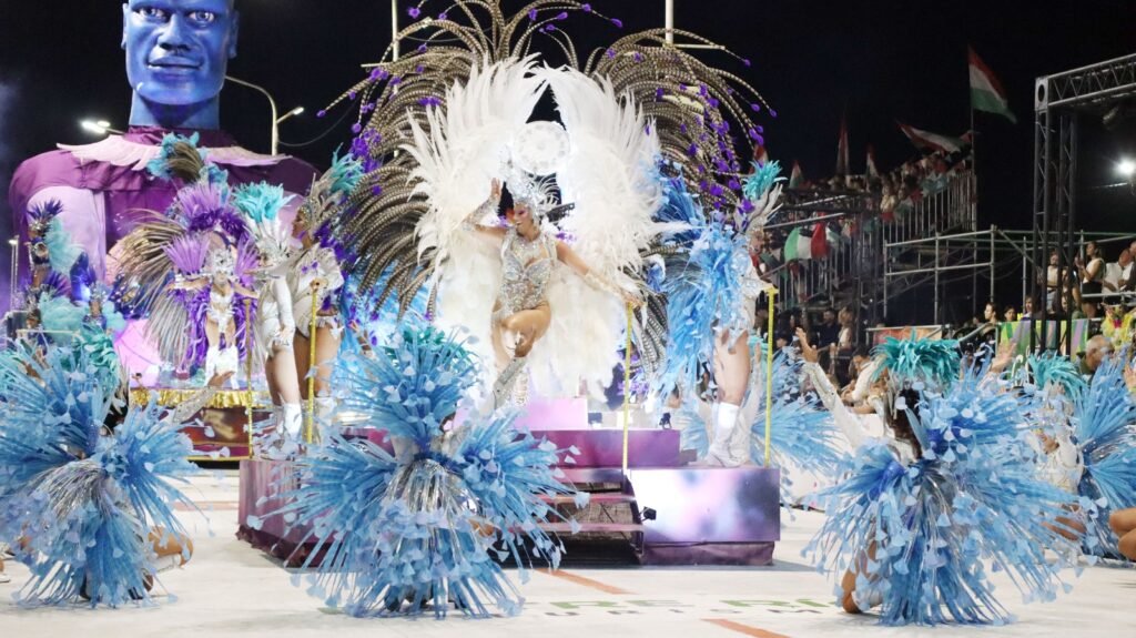Las comparsas en competencia —Ráfaga, Imperio, Emperatriz y Bella Samba— son las protagonistas, con trajes imponentes, música en vivo y una propuesta que transmite el espíritu festivo desde el primer minuto.