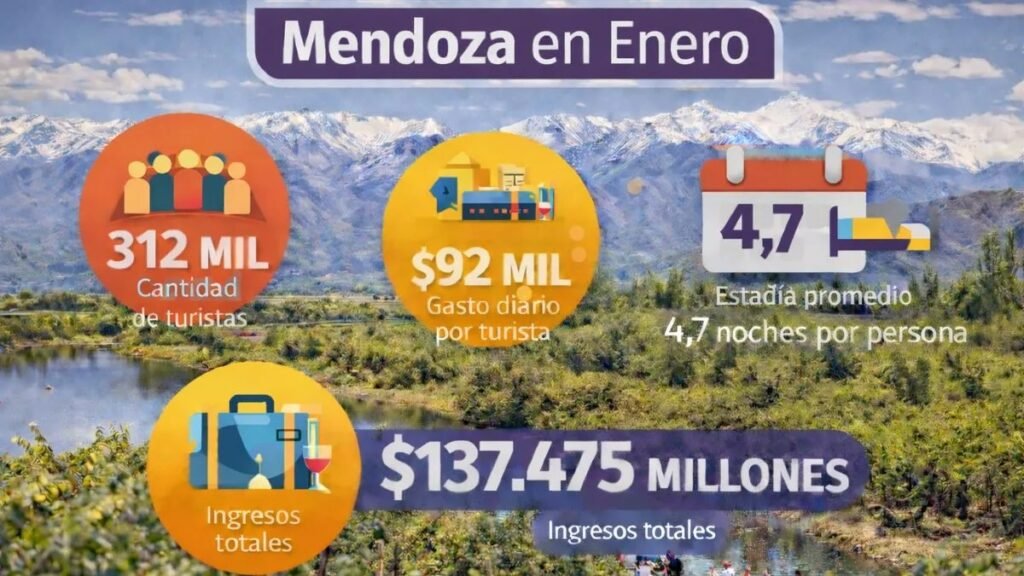Durante enero, el turismo generó un fuerte impacto económico en Mendoza, con un ingreso total de $137.475 millones, producto de la visita de 312 mil turistas, informaron desde el Gobierno de Mendoza. Este cálculo se basa en una estadía promedio de 4,7 noches y un gasto diario estimado de $92.500 por persona, se informó oficialmente.