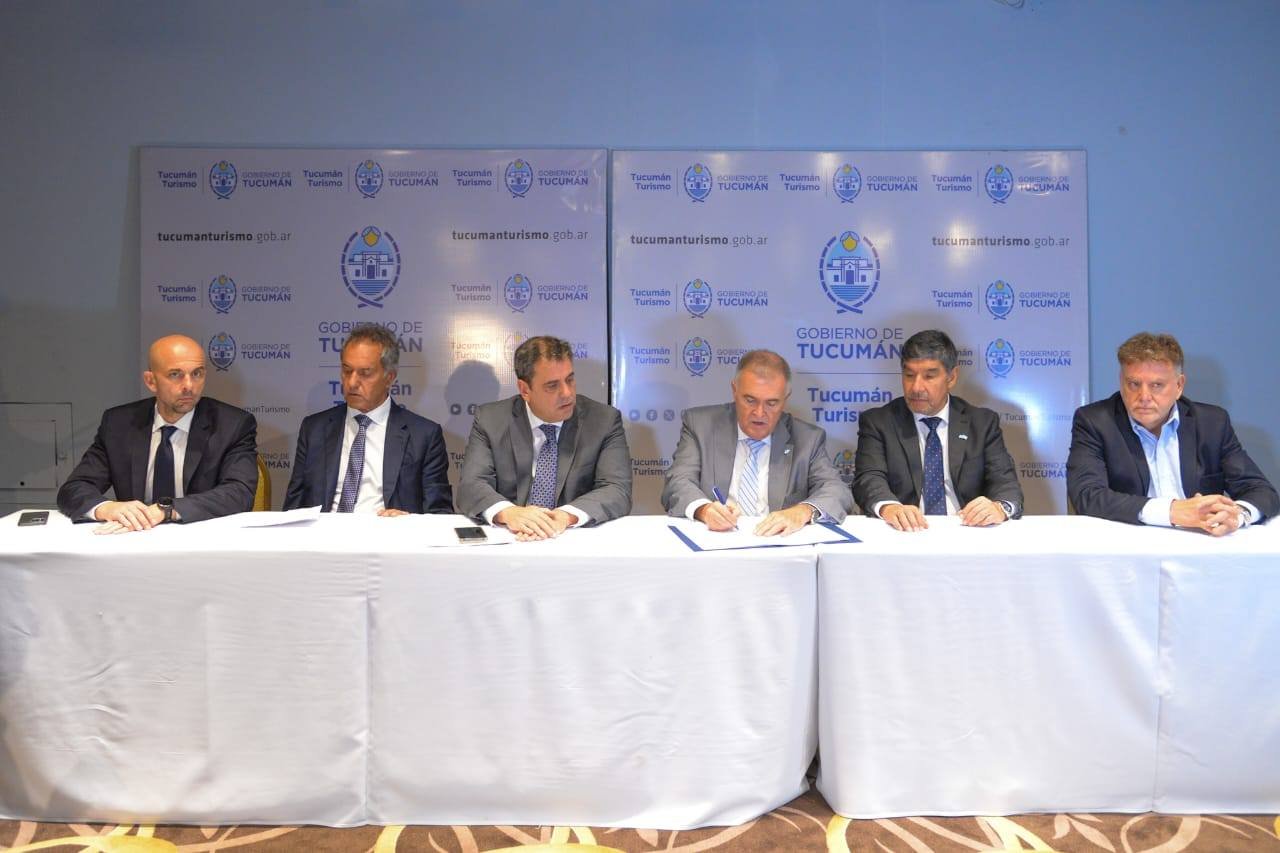 El gobernador Osvaldo Jaldo junto al viceministro de Gabinete del Interior de la Nación, Lisandro Catalán; el secretario de Turismo, Ambiente y Deportes de la Nación, Daniel Scioli; y el presidente del Ente Tucumán Turismo, Domingo Amaya, participaron de esta actividad. También participaron del acto el secretario de Transporte de la Nación, Franco Mogetta y el vicegobernador, Miguel Acevedo.