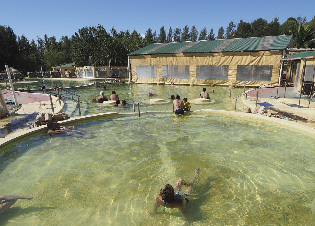 No hay multitudes. Apenas el murmullo del viento entre los álamos y la respiración honda de quienes vienen a buscar un alivio para el reuma o simplemente a detener el reloj interno. El complejo se desarrolla como un secreto bien guardado: piletas abiertas, senderos de tierra, y una paz que no se disfraza de espectáculo.