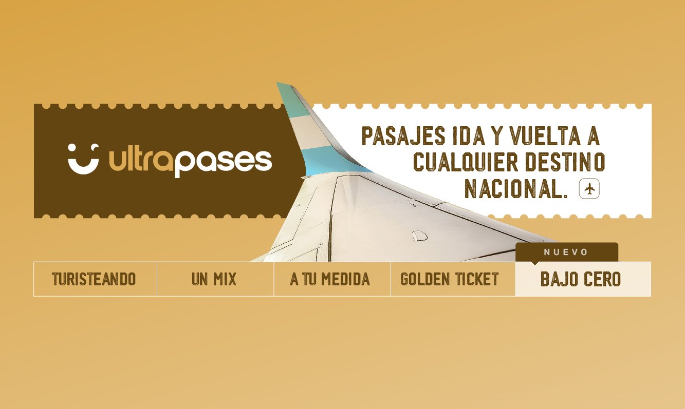 • Bajo cero: es el nuevo UltraPase para viajar en invierno. Incluye 3 viajes ida y vuelta para volar hasta septiembre inclusive y  permite volar desde Buenos Aires a Bariloche, Mendoza y Neuquén, y desde Córdoba a Bariloche y Neuquén.