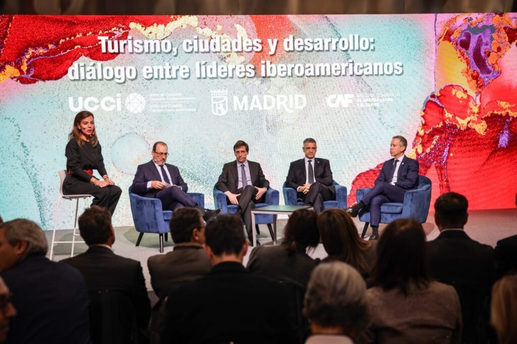 En el stand conjunto de la Comunidad de Madrid y el Ayuntamiento de Madrid, la Unión de Ciudades Capitales Iberoamericanas (UCCI) organizó el conversatorio “Turismo, ciudades y desarrollo: diálogo entre líderes iberoamericanos”, un espacio de reflexión sobre los desafíos del turismo urbano contemporáneo y la planificación estratégica de las ciudades. La actividad fue encabezada por José Luis Martínez‑Almeida, alcalde de Madrid y presidente de UCCI, junto con Jorge Macri como copresidente de UCCI, y contó con la participación de Almudena Maíllo, secretaria general de UCCI, además de alcaldes y referentes de diversas ciudades iberoamericanas.