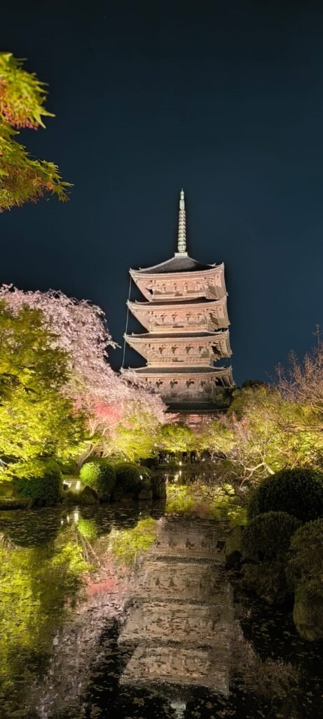 Pagoda de cinco pisos iluminada, la más icónica de Kioto, que pertenece al templo To-Ji, siendo con 55 metros el edificio de madera más alto de Japón. Se ilumina espectacularmente durante el otoño (especialmente de mediados de noviembre a principios de diciembre) y durante eventos especiales, reflejándose en el estanque del recinto.