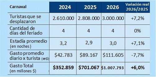 Los números del Carnaval 2026 fueron récord histórico en cantidad de turistas. La mejor marca se había logrado en 2023, con 2.925.000 viajeros, y ocurre en un contexto económico de muchas restricciones de ingresos en las familias, lo que refuerza la importancia que tienen estas fechas en la población.
