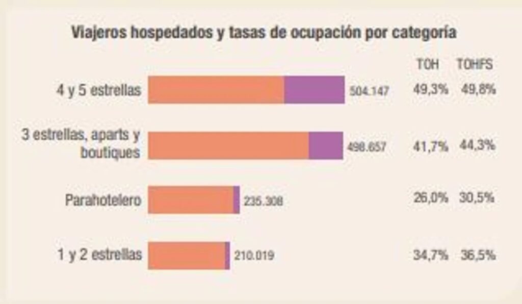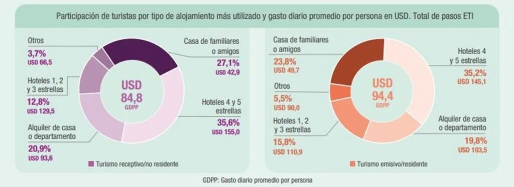 Por su parte, el turismo emisivo (residente) registró un GDPP ligeramente superior, de USD 94,4. Para este segmento, la elección de alojamiento también se inclinó hacia “Hoteles 4 y 5 estrellas” (35,2%), con un gasto diario de USD 145,1. La segunda opción más popular fue “Casa de familiares o amigos”, utilizada por el 23,8% de los turistas, con un gasto diario de USD 49,7.