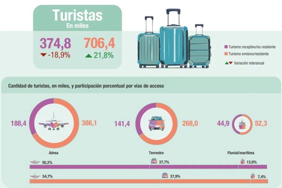 De los 1.204,6 miles que salieron del país, de los cuales 706,4 miles fueron turistas y 498,1 miles fueron excursionistas. El 65,1% del turismo emisivo se dirigió a los países limítrofes, liderados por Brasil (22,0%) y Chile (17,5%).