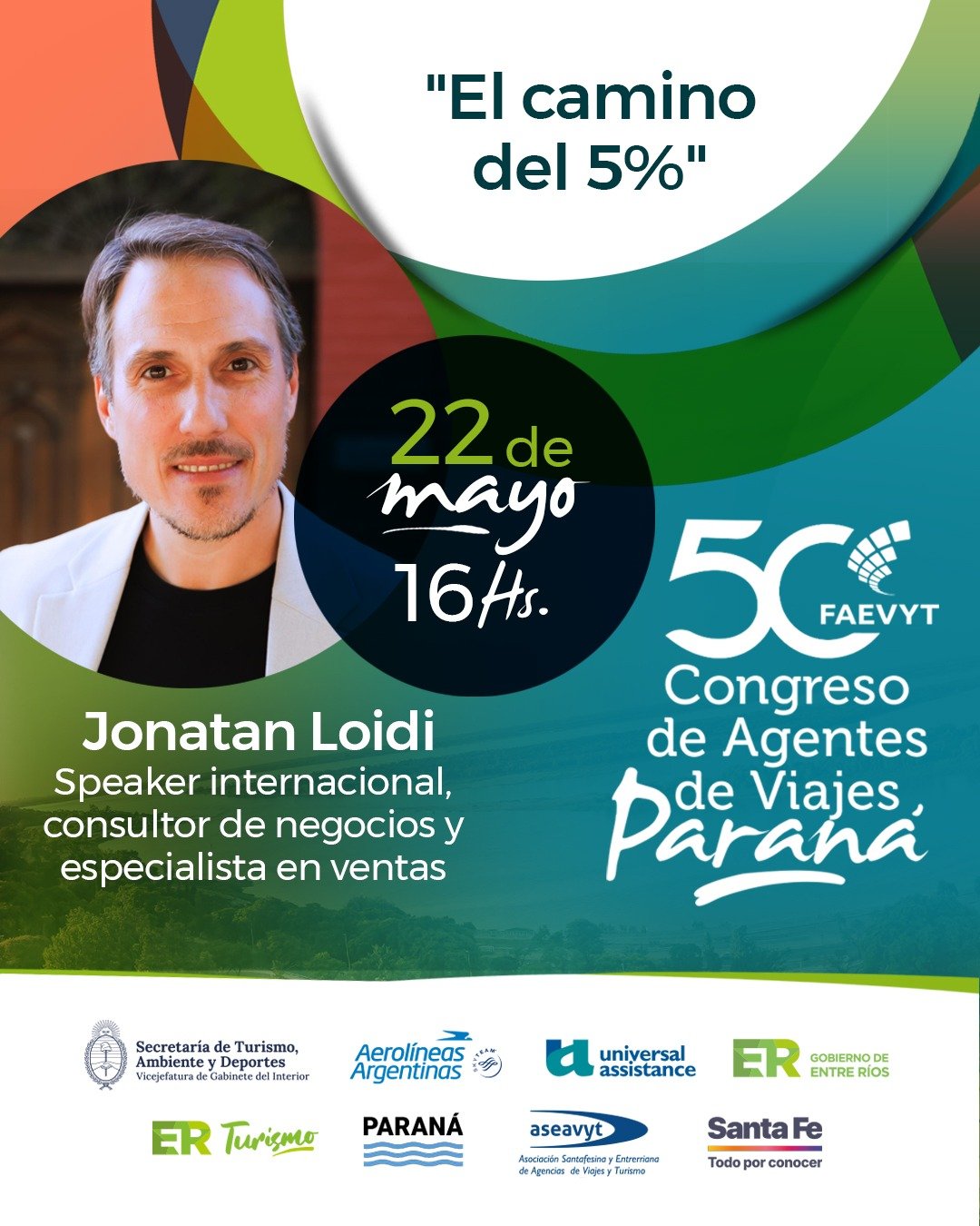 La conferencia magistral de Jonatan Loidi será uno de los momentos más esperados del 50° Congreso de Agentes de Viajes FAEVYT, que se llevará a cabo el 22 y 23 de mayo en Paraná, Entre Ríos. En su charla, Loidi abordará la importancia de la preparación como eje clave para la toma de decisiones efectivas en un contexto desafiante y cambiante para el sector turístico, resaltan desde la organización.