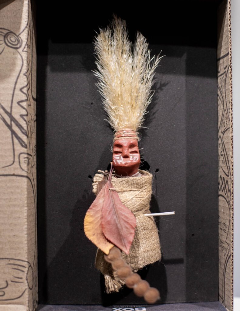Otra de las estatuillas es de cerámica pintada con óxidos minerales, tiene seda de coyoyo hilada por @elviraisolinabulacios, y elementos del monte hojas de otoño, totora de las Sierras de Ambato, vainas de tusca de Sierras Coloradas; y la tercera estatuilla es de cerámica: pintada, bruñida y ahumada, alpaca trabajada por @_miriflores y elementos del monte: claveles del aire y líquenes sobre corteza de árbol de las Sierras Coloradas.